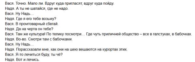 Шикарная обстановка курорта уравнивает всех. Здесь все одинаковые, все находятся в одном и том же статусе – отпускники. И не важно, что Василию надо лечить орган движения, а Раиса получила путевку, видимо, по блату. Эта разница здесь не очевидна. Здесь полно свободного времени, красивая обстановка, которую мужчине в обычной жизни надо создать самому, нет забот, все располагает к душевным разговорам… А еще есть развлекательная программа. Все, что нужно сделать людям – это слегка потянуться друг другу навстречу.