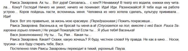 Я, кстати, читала и первоисточник. В пьесе Раиса Захаровна показана схематично. Набросана широкими мазками, так сказать, без такого акцента на эзотерике. Слушает пластинки, ходит в театр, читает книги. Дочь офицера кавалерии. Энтузиасты проводили расследование, и пришли к выводу, что одним из прообразов была дочь Буденного – художница, необычно оформившая свое жилище. А может, героиня просто косила под нее. Но в любом случае, ее социальная страта – интеллигенция. А вот Вася – простой работяга без претензий. Зачем он ей? Ну, даже если одинока – зачем тащить в свою жизнь такое очевидное «не то»?