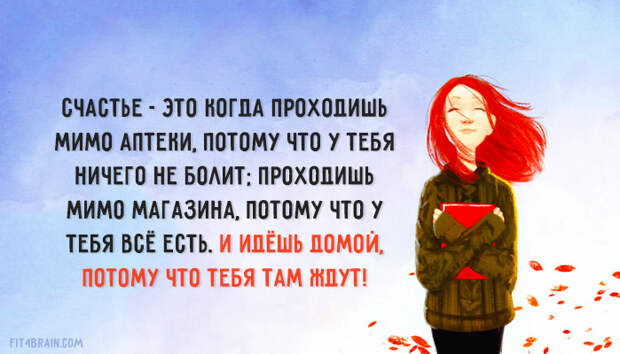 12. Заботьтесь о своем теле. Исследования, проведенные на страдающих клинической депрессией, показали, что физические упражнения повышают уровень счастья так же, как и антидепрессанты. И это еще не все. Полгода спустя люди, занимавшиеся физическими нагрузками, были менее склонны к рецидиву, потому что параллельно развили в себе чувство собственного достоинства и уважения.