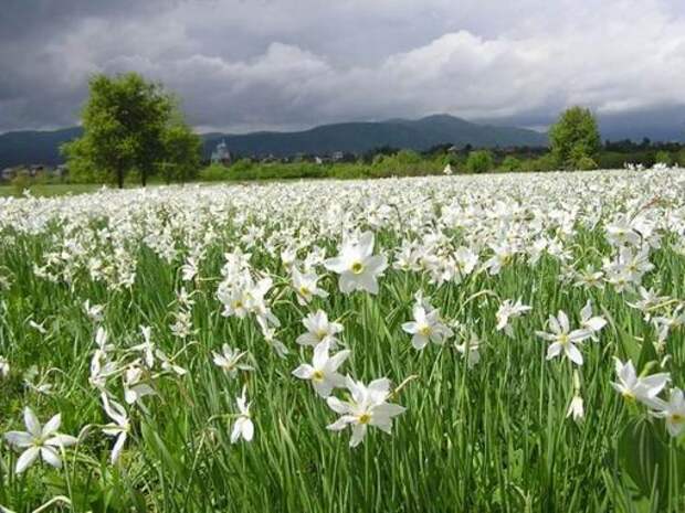 Каждый в своей жизни не раз видел нежный белый нарцисс и яркий желтый нарцисс. Эти цветы одни из первых вестников весны, радуют нас своей красотой и приятным запахом. Сегодня в цветочным магазинах можно увидеть и красивый розовый нарцисс, который специально выращивают для продажи. Несмотря на огромную популярность в городах этого нежного цветка, существует и поле нарциссов, за которым никто специально не ухаживает.